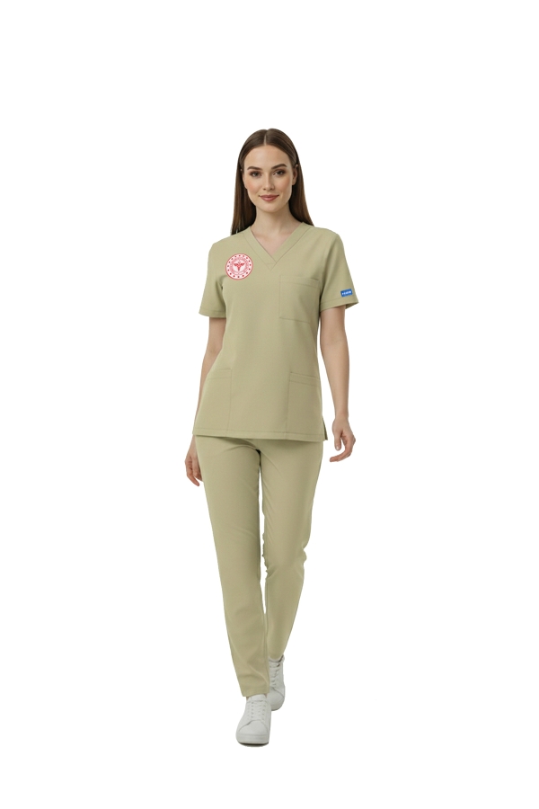 Bej Teknisyen Tekniker Tıbbi Sekreter Forması Pozitif Likralı Scrubs Takım (Yeni Yönetmelikle Uyumlu – Moth)