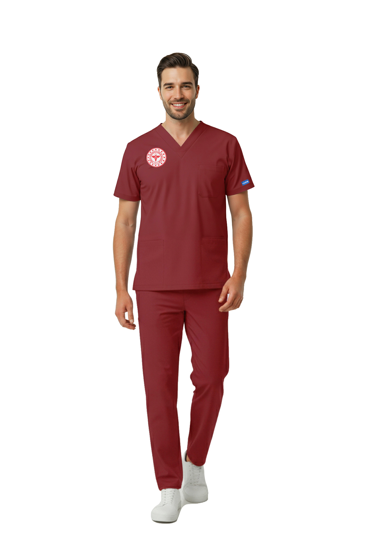 Bordo Lisans ve Lisansüstü Sağlık Meslek Mensupları Forması Pozitif Likralı Scrubs Takım (Yeni Yönetmelikle Uyumlu – Biking Red)