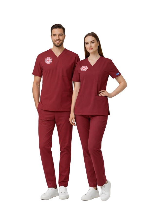 Bordo Lisans ve Lisansüstü Sağlık Meslek Mensupları Forması Pozitif Likralı Scrubs Takım (Yeni Yönetmelikle Uyumlu – Biking Red)