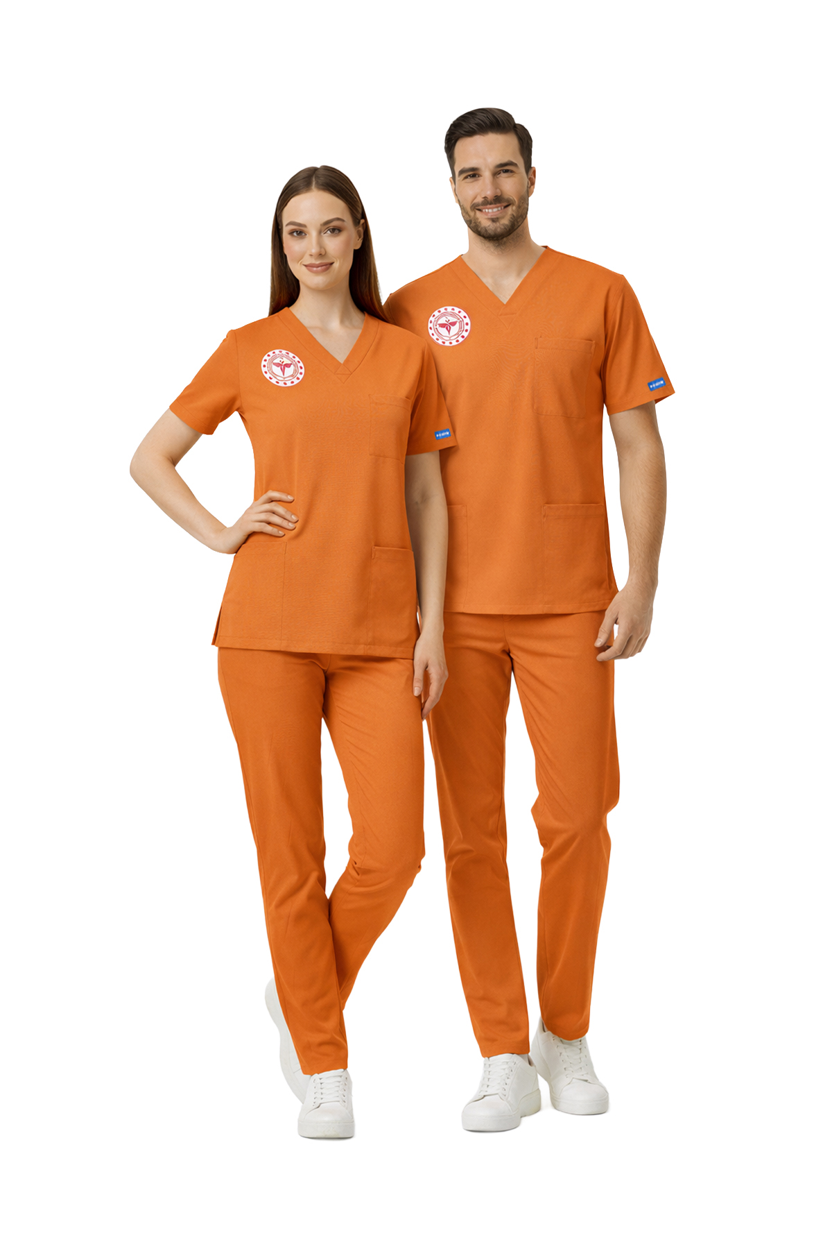 Turuncu Klinik Destek Personeli Forması Pozitif Likralı Scrubs Takım (Yeni Yönetmelikle Uyumlu – Orange Ochre)
